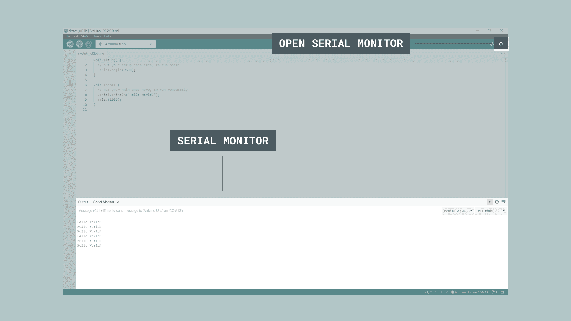 To see the actual messages the Arduino is sending to our computer, we use the Serial Monitor.
